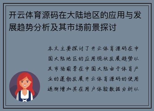 本文主要探讨了开云体育源码在中国大陆地区的应用现状、发展趋势以及市场前景。在中国大陆,由于体育产业的蓬勃发展,开云体育源码的使用逐渐增加,其在用户体验、数据分析、以及市场渗透等方面都取得了显著进展。文章将从四个方面进行深入分析:开云体育源码的技术优势、在中国大陆市场的应用场景、面临的政策与法规挑战、以及未来的市场发展趋势。同时,本文还将结合市场情况与技术演变,对开云体育源码在大陆的未来前景进行综合评估和展望。通过对这些方面的探讨,本文为行业从业者提供了对开云体育源码的全面认识,助力相关企业抓住市场机会并规避潜在风险。